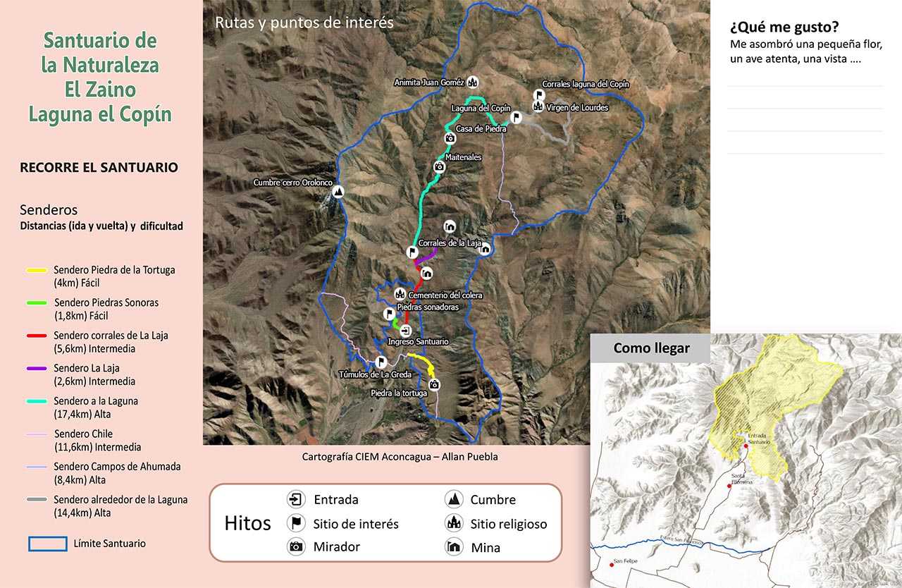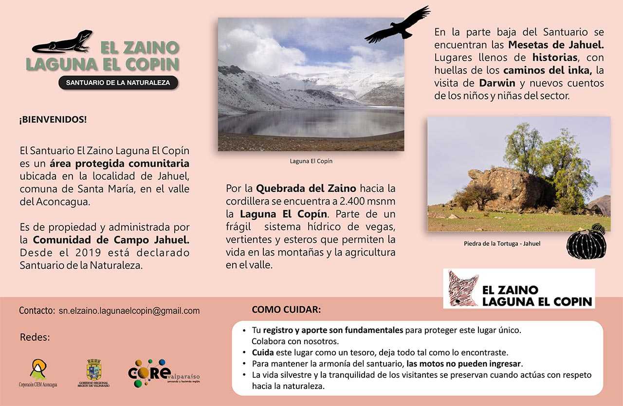 El Santuario de la Naturaleza El Zaino – Laguna El Copín (SN) se encuentra ubicado en sector El Zaino del Valle de Jahuel, un rincón verde cerca de la cordillera norte del Valle del Aconcagua. Si bien, se puede ingresar desde diferentes comunas, como Putaendo y San Esteban, el acceso principal se ubica por la comuna de Santa María. Se encuentra a una distancia cercana a los 19 km desde la ciudad de San Felipe que se traduce en un tiempo estimado que fluctúa entre los 30 y 40 minutos. El camino que conecta el centro urbano con el acceso al SN está habilitado y en condiciones óptimas para todo tipo de vehículo. El transporte público o locomoción colectiva sólo presta servicio de acercamiento al punto de ingreso y tienen una escasa permanencia horaria, los nombres de dichos prestadores a los que se les puede solicitar información más detallada es: “Empresa VerArcos Ltda” y “Transportes Lucero”.